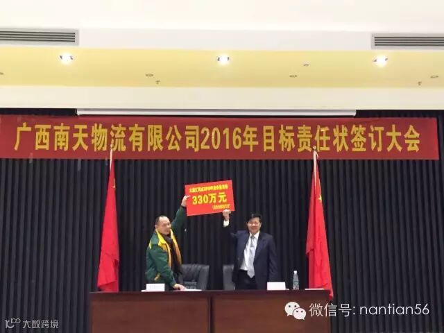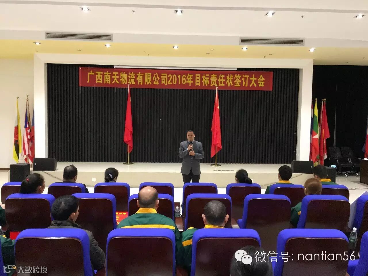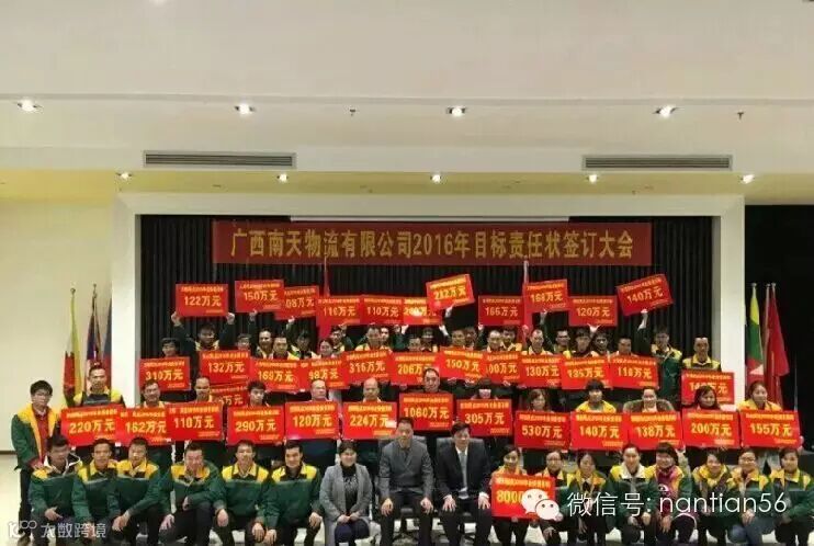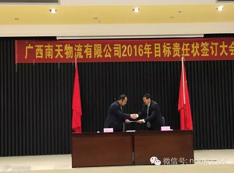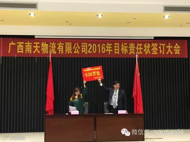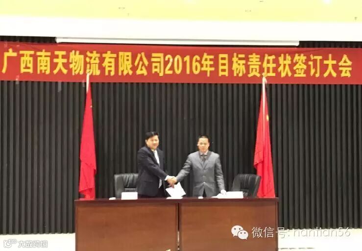 为了提高广西南天物流有限公司各分公司、各营业点及总部全体员工的积极性,确保2016年度经营目标的实现。2016年2月15日上午,广西南天物流有限公司于华南城4号馆五楼会议厅隆重举行了“2016年目标责任状签订大会”。公司董事长韦增宝、总经理陈德春及管理人员、各分公司、各营业点负责人参加了此次会议。
