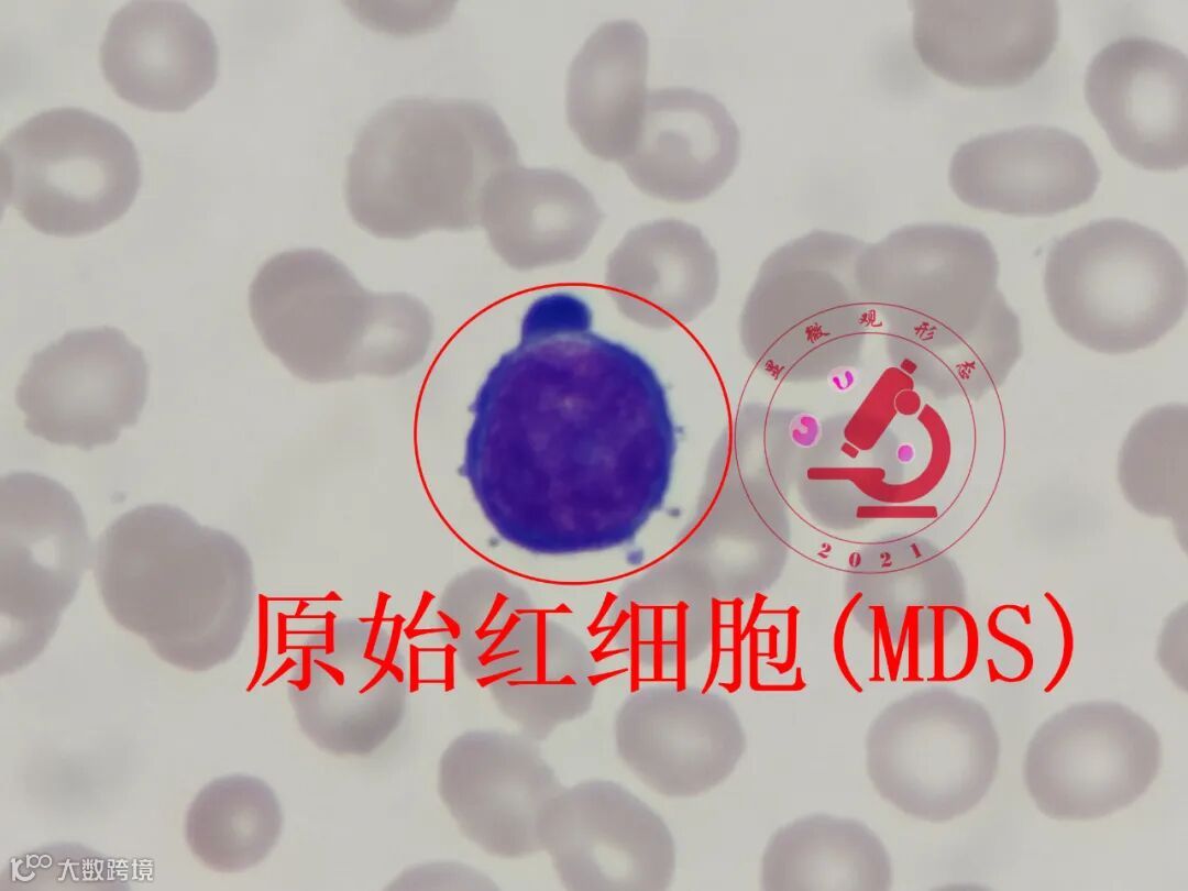 原始红细胞:其胞体直径15~25μm,圆形或椭圆形,常有瘤状突起。胞核圆形,居中,核染色质呈颗粒状(较粗),核仁1~3个,大小不一,染浅蓝色,边界不清楚。胞质较多,深蓝色且不透明,有油画蓝感,在核周围常形成淡染区;胞质中无颗粒,但因核糖核酸丰富而自行聚集,使胞质中出现蓝色“颗粒”。