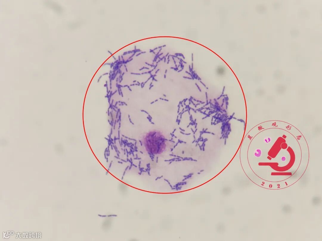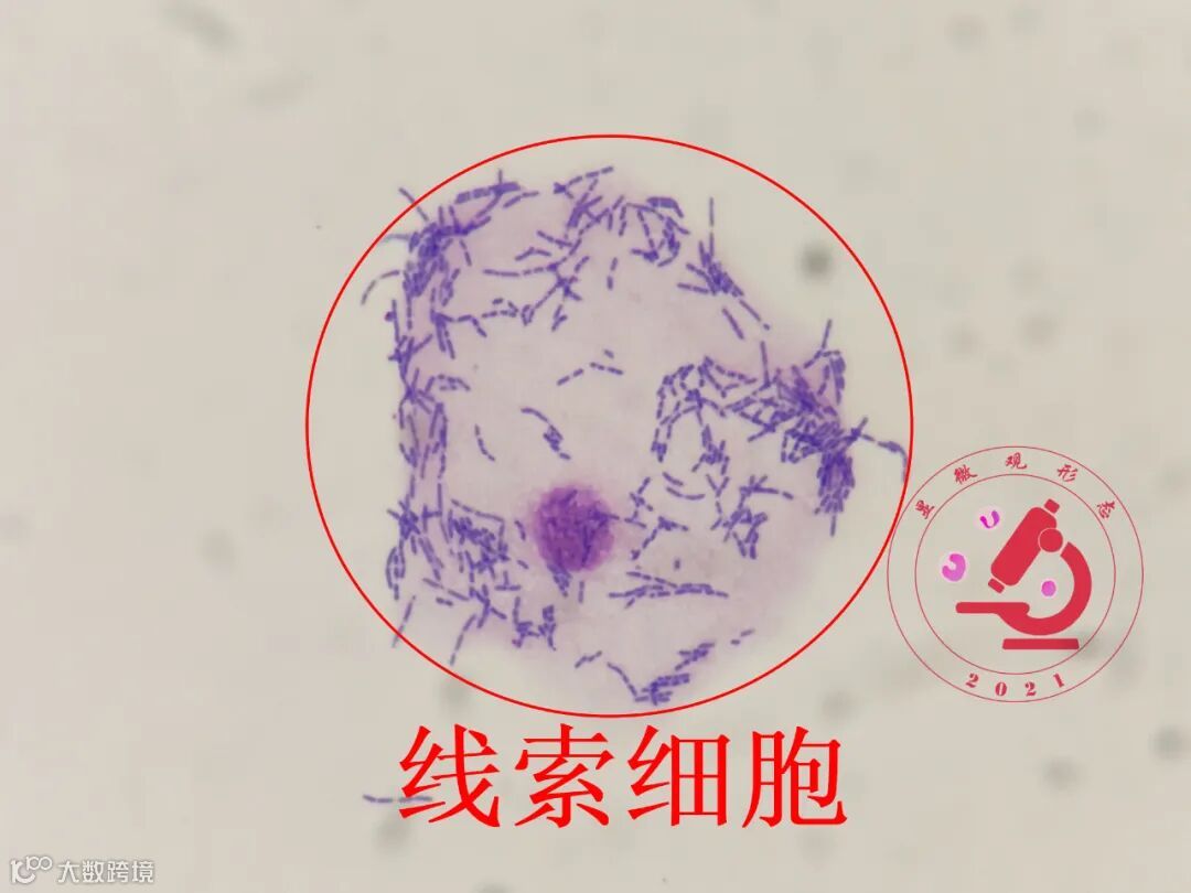 线索细胞:鳞状上皮细胞黏附大量加特纳菌或厌氧菌形成,细胞边缘锯齿状,核模糊不清,细胞上覆盖大量杆菌,表面毛糙。