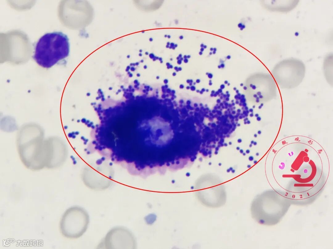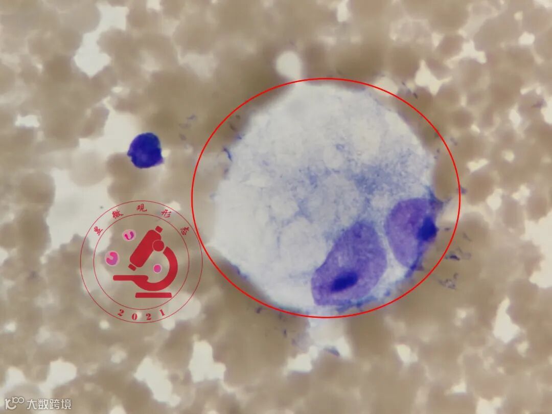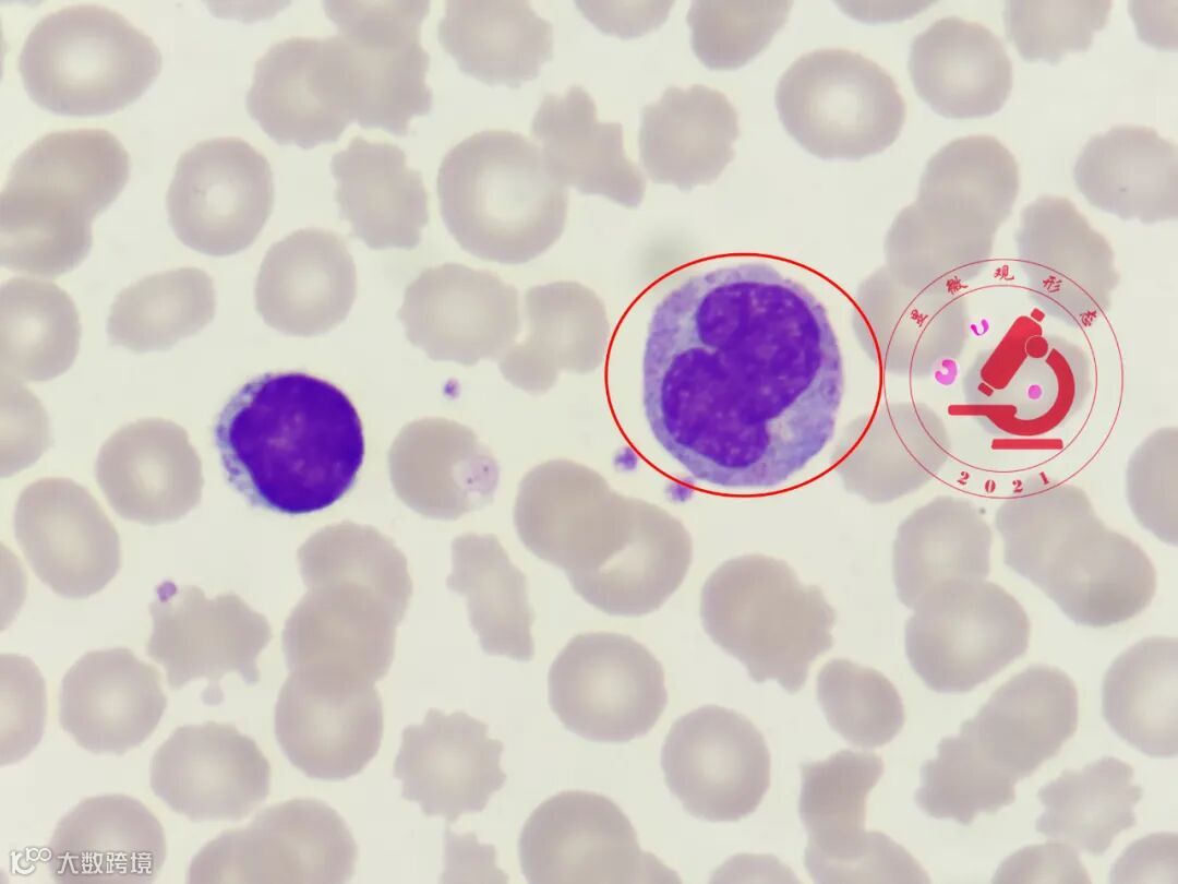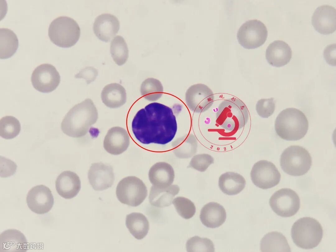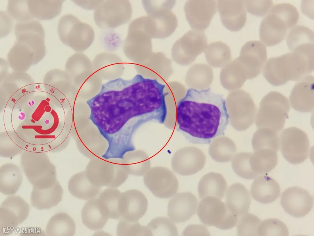 单核细胞:胞体直径12~20μm,圆形或不规则,可见伪足;胞核不规则,呈扭曲、折叠状,或呈大肠状、马蹄形、S形、分叶形、笔架形等;核染色质疏松,可呈条索状、小块状,核仁消失;胞质多,呈浅灰蓝色或略带红色,半透明如毛玻璃状,胞质内可见细小、分布均匀的灰尘样紫红色颗粒,常有空泡。