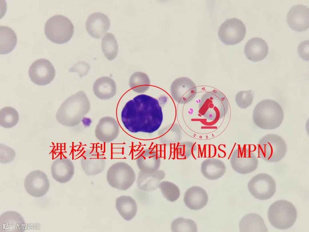 裸核型巨核细胞:其胞膜不完整,胞质无或有少许(胞质中有较细小、大小一致的淡紫红色颗粒),胞核巨大(直径约20-40μm),核型不规则,核染色质呈条状或块状。由于胞体较大,该细胞常位于血涂片的尾部,应注意与破碎细胞鉴别。