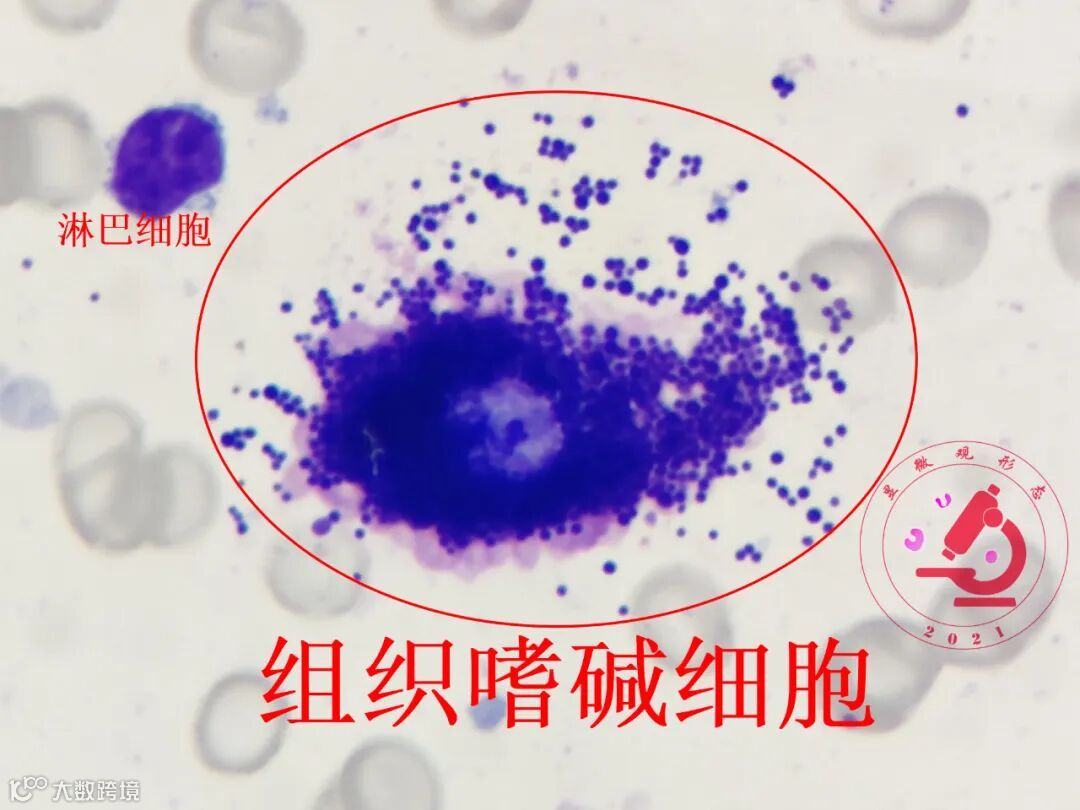 组织嗜碱细胞:又称为肥大细胞。其胞体直径12~20μm,蝌蚪形、梭形、圆形、椭圆形、多角形等。胞核较小、圆形,常被颗粒遮盖,核染色质块状,无核仁。胞质较丰富,充满粗大、圆形、排列紧密、大小一致、深紫红色的颗粒,胞质的边缘常可见突出的颗粒,有时胞体周围可见淡紫红色的红晕。有的组织嗜碱细胞胞质中颗粒排列非常致密,整个细胞呈黑色,易误认为异物而被忽略。