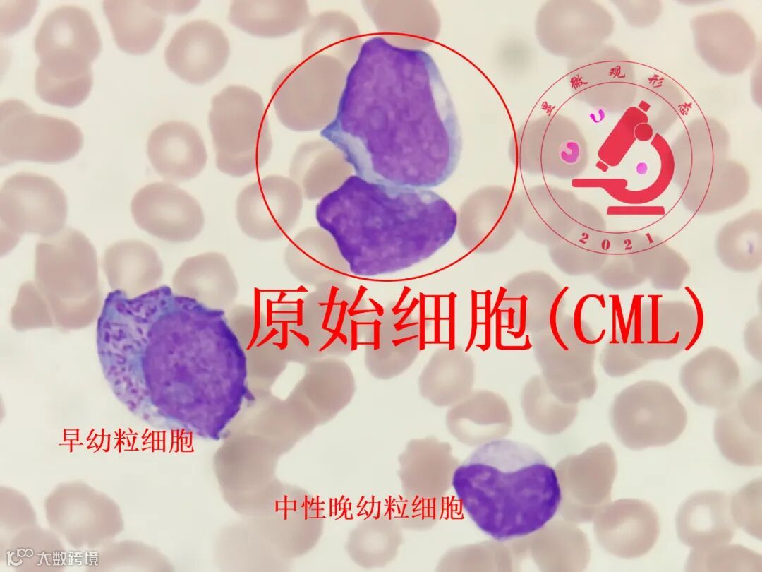 原始细胞:原始粒细胞,胞体直径10~20μm,圆形或类圆形;胞核较大,圆形或类圆形,居中或略偏位;核染色质细颗粒状,排列均匀,平坦如一层薄沙,无浓集;核仁2-5个,较小,清楚,呈淡蓝色。胞质较少,呈蓝色或深蓝色,绕于核周,有时在近核某处浆色较淡,颗粒无或有少许细小颗粒。