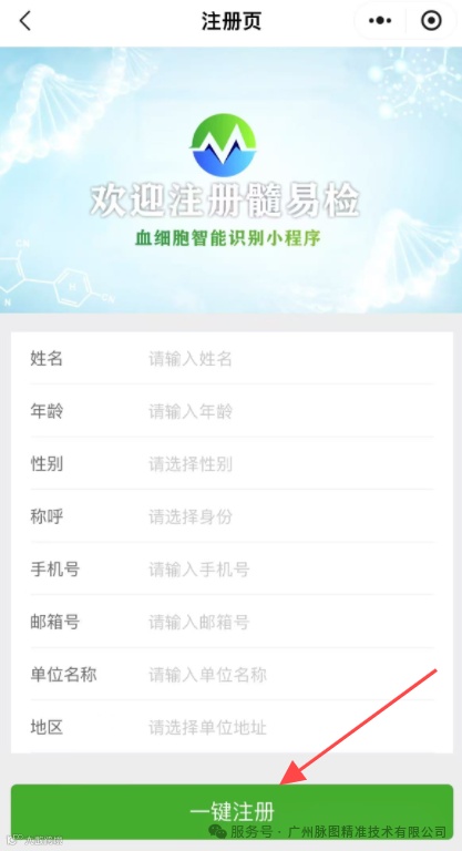 打开微信服务号,搜索“广州脉图”(广州脉图精准技术有限公司),点击关注服务号,点开左下角小程序,在右下角【我的】登录,填写信息,完成注册。