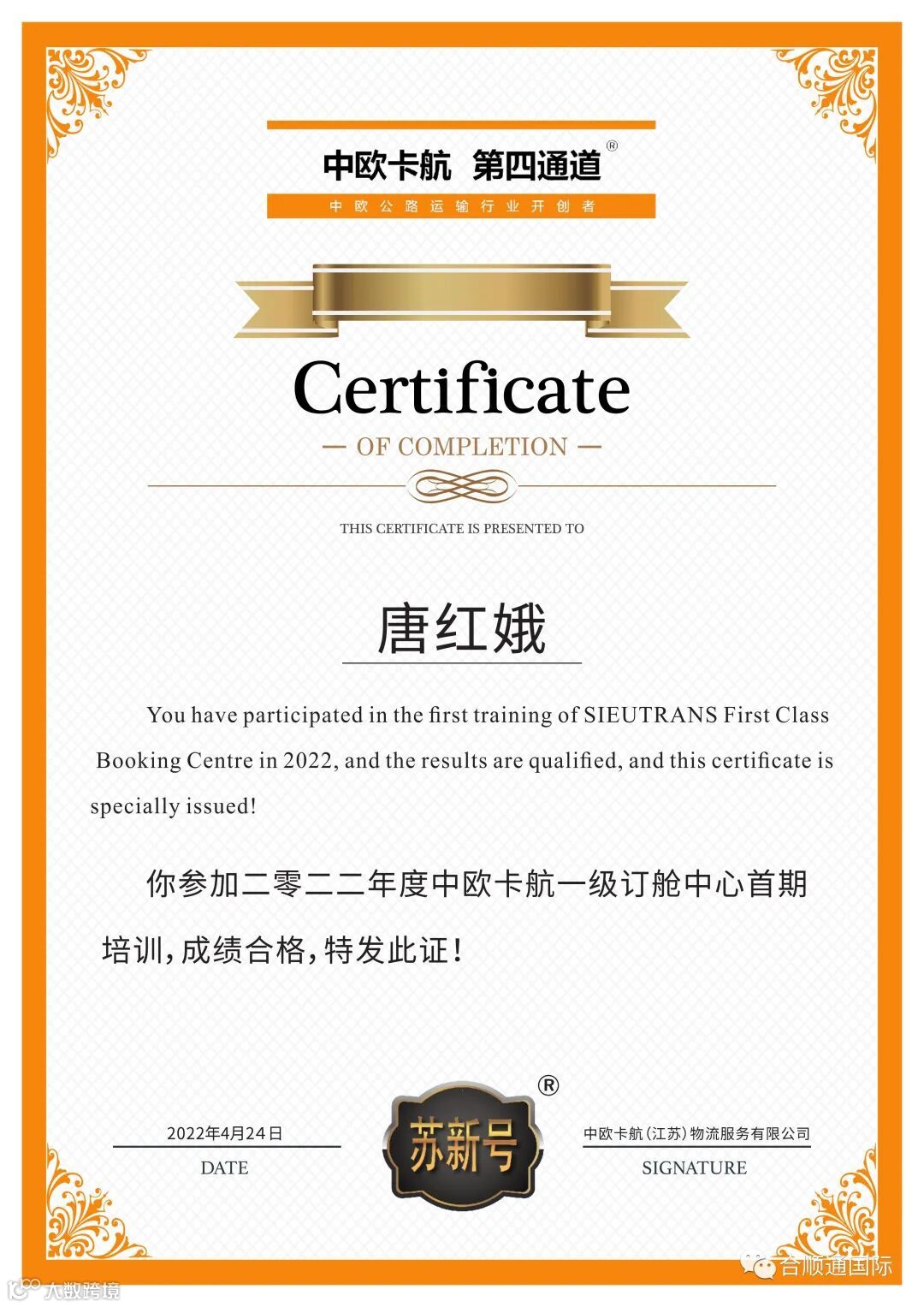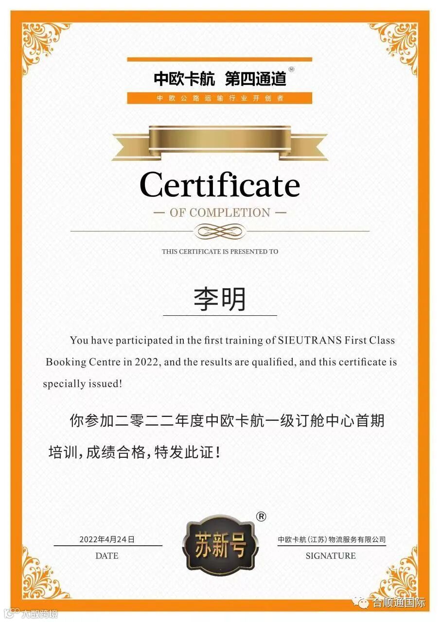 中欧第四通道——苏新号二零二二年度一级订舱中心首期培训证书,中欧公路“黄埔一期”. 我们会继续努力, 坚定步伐和方向,向优秀的人学习,努力成为中欧公路运输行业的精英!