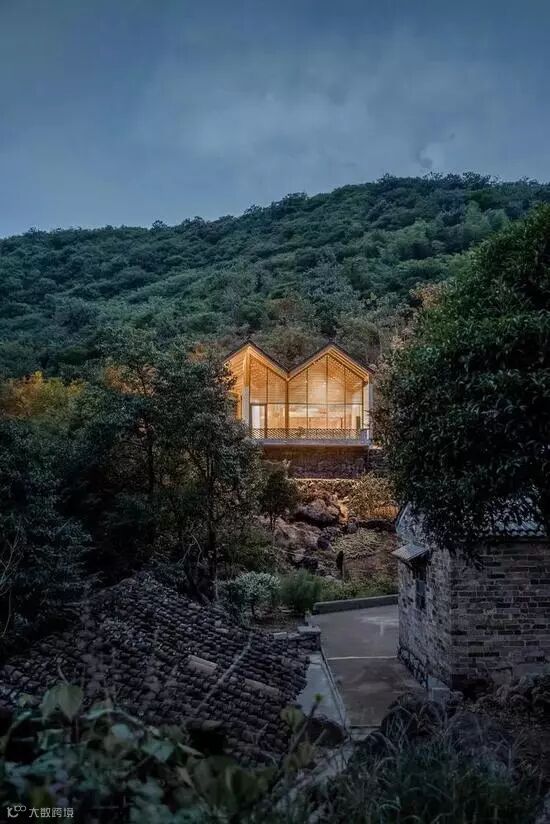 从东起,一跨形成地块南向的作为起居室的前厅空间,一跨与横向展开的部分残墙形成的庭院空间及其二层的玻璃观景平台,一跨与西侧的原建筑墙体形成的卧室空间,增加一跨向西将山体和营造的部分景观空间纳入其半开放的檐下虚空间;由此在南立面上构成一幅传统语境下的当代拼接画。