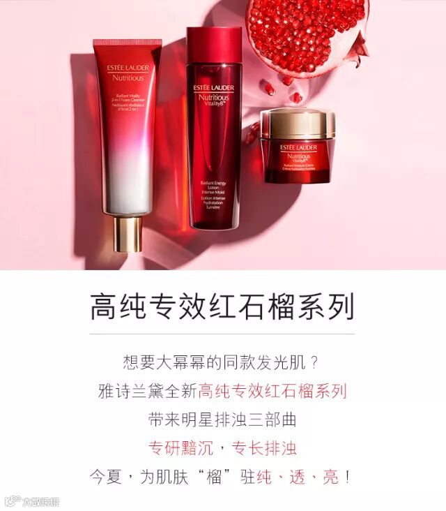 高纯专效系列:专研黯沉,专长排浊;封存一整颗地中海阳光红石榴精粹,针对亚洲肌肤设计,深彻排浊,祛黯沉黯黄,注入丰沛鲜养,肌肤纯·透·亮!