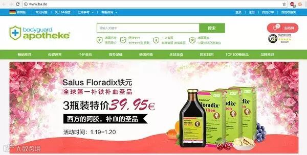 德国国家批准的网上药店。德国BA保镖药房(Bodyguard Apotheke)棣属德国百年实体连锁药房Einhorn Apotheke(独角兽药房),囊括7万多种德国本土好货,包括非处方药品、保健品、母婴用品、药妆、有机护肤品、家居日用品等。2014年开通中文站,支持DHL直邮中国,支付宝、银联付款,一般说来,下单后约半个月即可收到包裹!