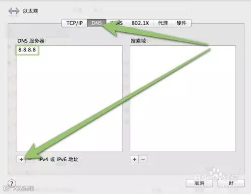 在高级选项设置窗口中,选中DNS选项卡,按左下角的加号键添加一个DNS服务器地址,如8.8.8.8,也可以添加多个备用的