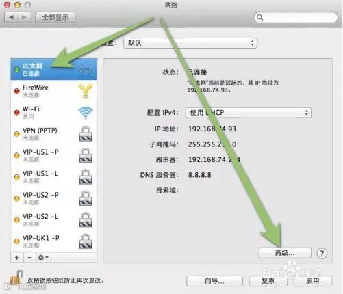 在网络界面,选中正在联网的网络连接,点击右下角的“高级”选项。