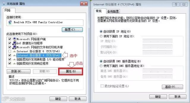 Window7及以上操作系统:打开网络和共享中心,找到本地连接,点击属性,然后选择internet 4 协议。双击打开。然后在首选DNS和备用DNS。
