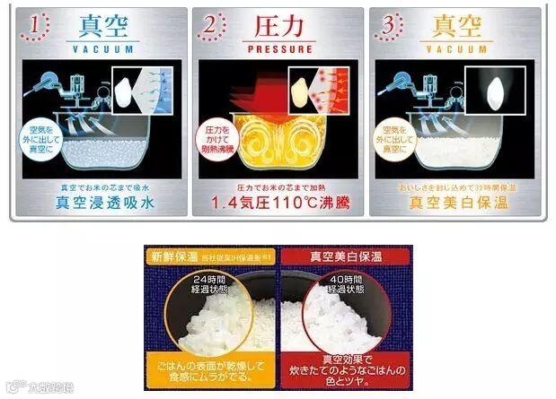 三、还有三菱电饭锅则具有的超声波吸水技术和蒸汽智能吸放技术。