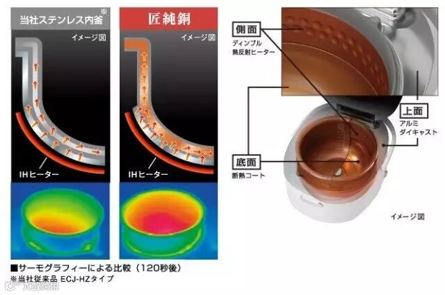 东芝家的锅叫锻造丸釜,也是模仿柴火釜的造型做的,内部是铜涂层,外部是银涂层,去年的旗舰“本丸釜”外部是金涂层。
