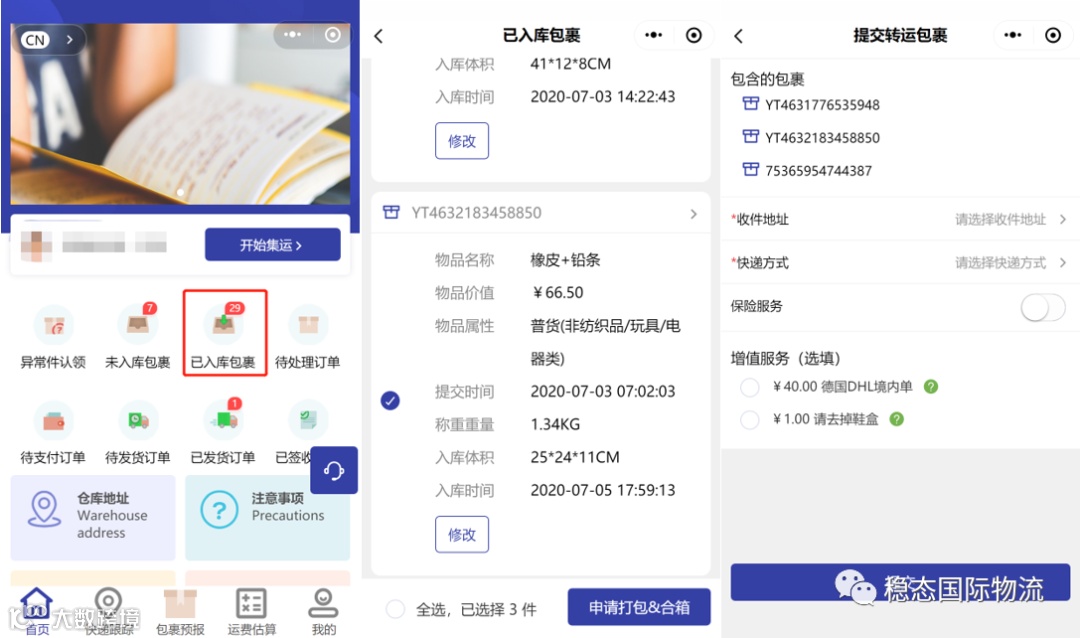 我们开发了专属小程序,配合背后强大的稳态智能集运系统,您可以随时查看包裹信息,您任选包裹,都可以准确无误的被工作人员打包合箱。发货后也能实时追踪物流信息!入库出库都会拍照称重,包裹信息人工核对,规范化操作流程,货物动态让您了如指掌!