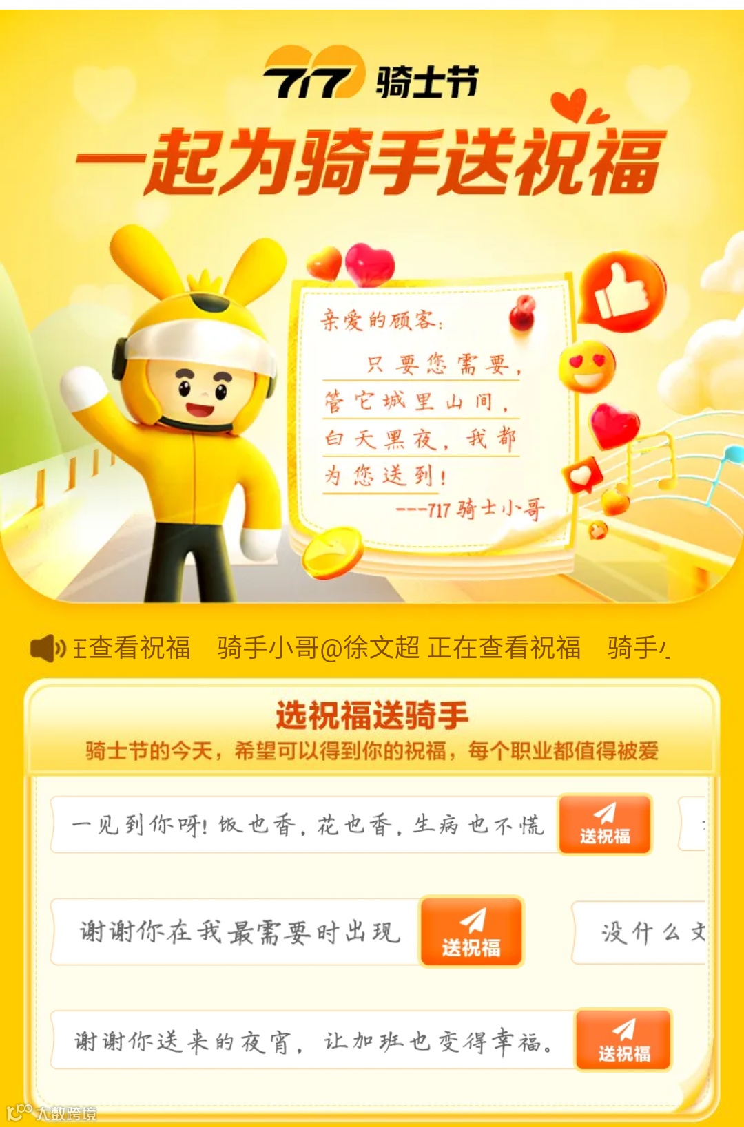王莆中表示,以“骑一骑”为谐音设立专属于骑手的“717骑士节”,初衷是以此表彰、关怀、鼓励和感激几百万骑手日复一日的辛勤付出,树立职业价值感和社会认可度;同时,平台也借节日契机,发布系列改善骑手配送体验和关怀骑手的新举措,共同助力即时配送行业向好向上发展。
