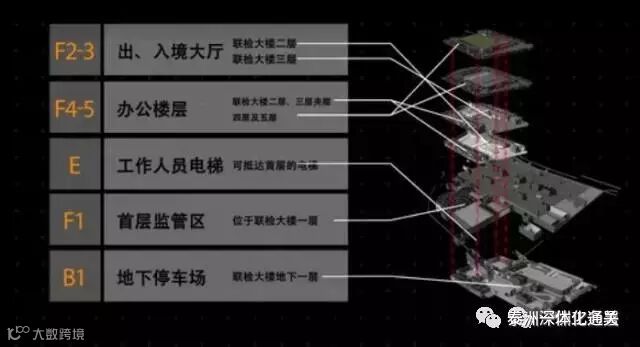 工作人员通过设置在出入境大厅两侧的两台垂直电梯连接地下停车场出、入境大厅和办公楼层。其中一部电梯可到达首层监管区。