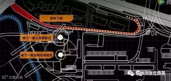 通过西岭下路进入地下一层公交接驳区或出租车接驳区