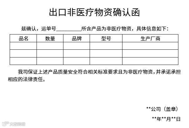 4. 出口非医疗物资确认函(非医用的口罩、防护服、非医用红外体温计适用)。下载模板网址:https://marketing.5idhl.com/Number5B/,并加盖发件企业公章(或业务章)