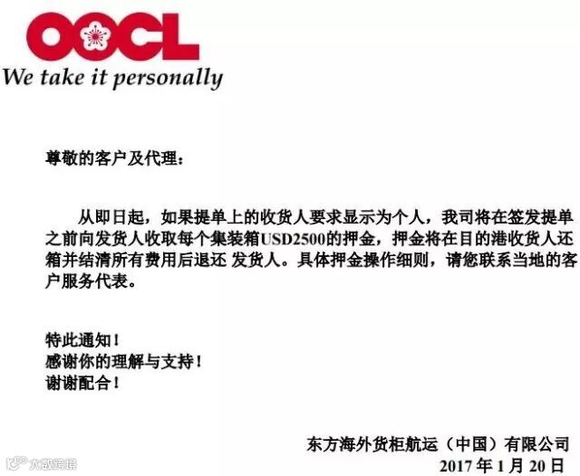 东方海外日前发布通知,如果提单上的收货人要求显示为个人,OOCL将在签发提单之前向发货人收取每个集装箱2500美金的押金,押金将在目的港收货人还箱并结清所有费用后退还发货人。