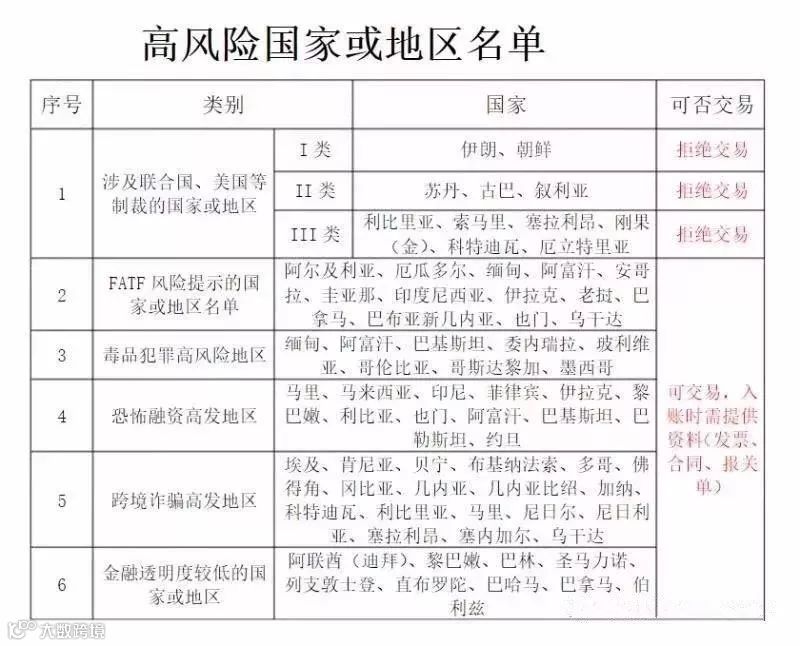 包括伊朗、苏丹、朝鲜、叙利亚、古巴,这5个国家是受联合国和/或美国制裁的,国内大部分银行拒绝办理这些国家的任何国际业务。