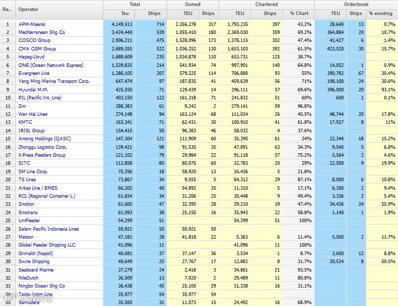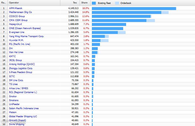 排名位列第十一至二十位的分别是:以星航运、万海航运、高丽海运、伊朗国航、安通控股、中谷物流、新加坡X-press、海丰国际、SM商船、德翔航运。根据统计,排名前二十的集装箱班轮公司运力占全球的89.6%。