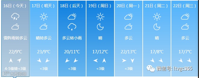 根据最新气象资料分析,预计16日白天我市将有一次阵雨或雷雨天气过程,降水分布不均,大部分地区过程雨量5毫米左右,局部10~30毫米,最大雨强可达10~20毫米/小时;并可能伴有强雷电、短时强降水、雷雨大风和局部小冰雹等强对流天气,雷雨时短时阵风陆上8~9级,沿海海面9~10级。
