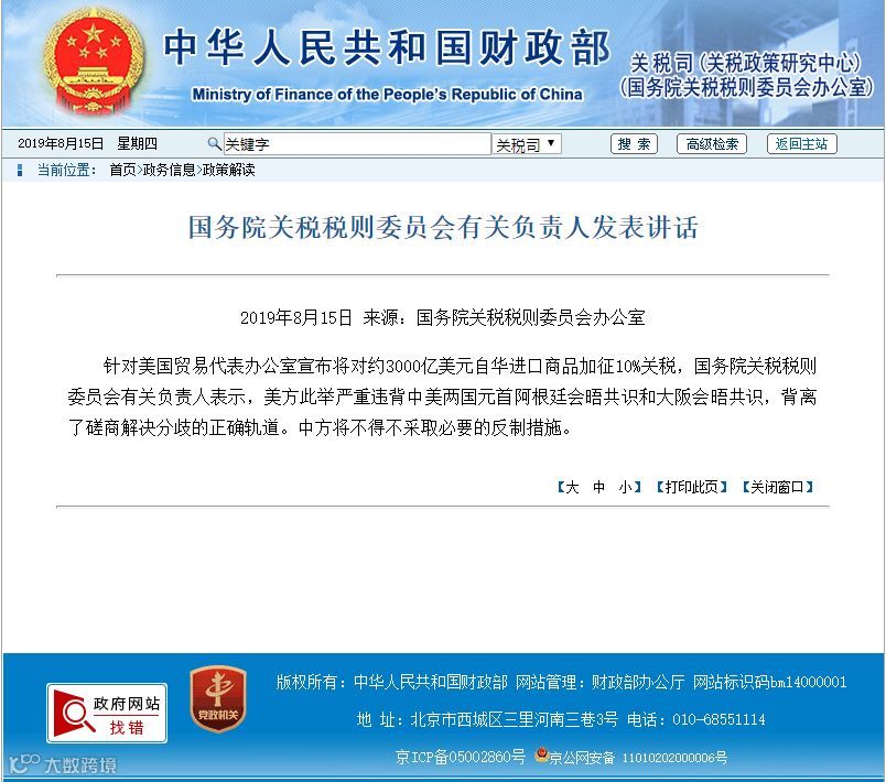 针对美国贸易代表办公室宣布将对约3000亿美元自华进口商品加征10%关税,国务院关税税则委员会有关负责人表示,美方此举严重违背中美两国元首阿根廷会晤共识和大阪会晤共识,背离了磋商解决分歧的正确轨道。中方将不得不采取必要的反制措施。