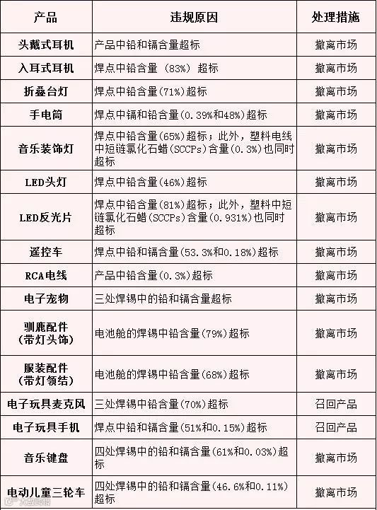 此次被通报产品主要集中在玩具、耳机和照明设备,其中玩具类产品占了68%,是RoHS违规产品的重灾区。产品焊点中铅含量超标为主要的违规原因,共有22款,其中有13款产品的镉含量也同时超标。