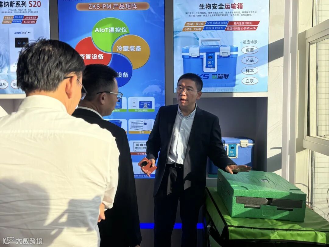 蔡旭东先生在此基础上详细介绍了由无线通讯技术“in terBow”衍生而来的洲斯物联的创新产品,包括生物安全冷链箱和ZKS-S6智能温湿度记录仪等,展示了这些产品如何在医药物流领域提升效率和安全性,并强调了这些产品在医药物流领域的实际应用和重要性。