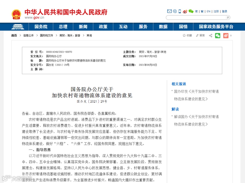 为进一步满足广大农村群众对更高标准、更多种类寄递服务的需求,充分发挥邮政快递业在服务乡村振兴中的重要作用,在前期深入调研、听取意见建议的基础上,国务院办公厅出台了《关于加快农村寄递物流体系建设的意见》。