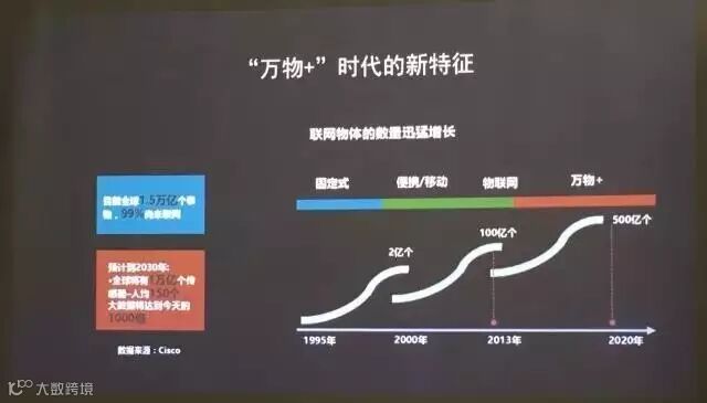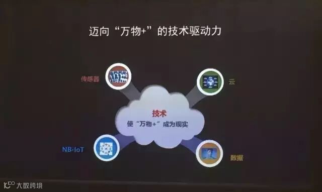 很重要的一个驱动因素,就是由于全球的手机普及,传感器的价格不断下降。原来的传感器非常贵,传感器就是半导体,必须有规模效应。手机大规模普及后,各种各样的传感器规模化以后,价格不断的便宜下来,这是万物互联很重要的一个技术基础。第二个,连接之后这么多数据怎么处理?这5、6年来云计算把技术处理能力变得越来越巨大了,今天摄像头的数据,过去都是存不下来的。传感器、网络、数据和云,这几个技术合在一起,在未来我认为就是“万物+”时代的到来,从大数据的连接,大数据的手机,到成百亿、上千亿数量级的连接。“万物+”这个概念,比如基本上每一个汽车,肯定都是一大堆传感器。