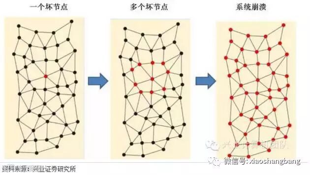 我们可以引用一个管理学上的“酒与污水定律”。意思是一匙酒倒进一桶污水,得到的是一桶污水;把一匙污水倒进一桶酒里,得到的还是一桶污水。在一个完全去中心化的体系里,一个节点的缺失或者坏节点的进入很可能破坏或者毁灭原有体系,原因就在于一个坏节点的进入会破坏信任机制,最坏的结果是引发连锁反应形成恶性循环导致平台“崩溃”。