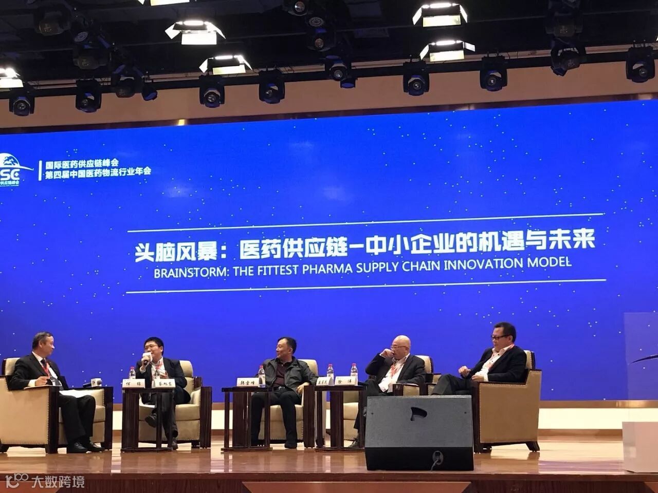X分论坛头脑风暴环节深圳洲斯移动物联网技术有限公司董事长蔡旭东、天津德利得供应链管理股份有限公司运营总监恽绵 、天士力控股集团有限公司物流中心总监徐伟 、华润河南医药有限公司副总经理盛宗民 、传化智联股份有限公司港港互通事业部总经理韩雪峰 、就中小型医药商业企业经营模式、延伸服务等话题展开互动。