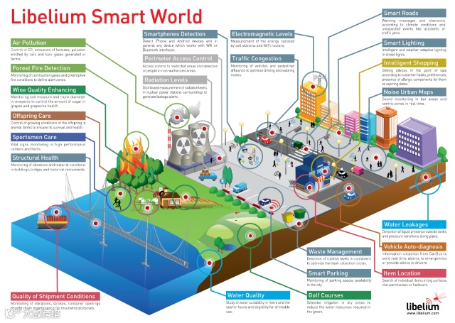 物联网其中的应用-智能城市,常成为政治人物挂在口中的愿景。不论是住家的尺度,还是大到城市的尺度,都是需要探测器,替大家收集数据,因此探测器厂商在物联网中的角色相当重要。西班牙探测器厂商 Libelium,推出的资讯图表 Libelium Smart World,描述城市生活或是生产活动,无处不在的探测器。
