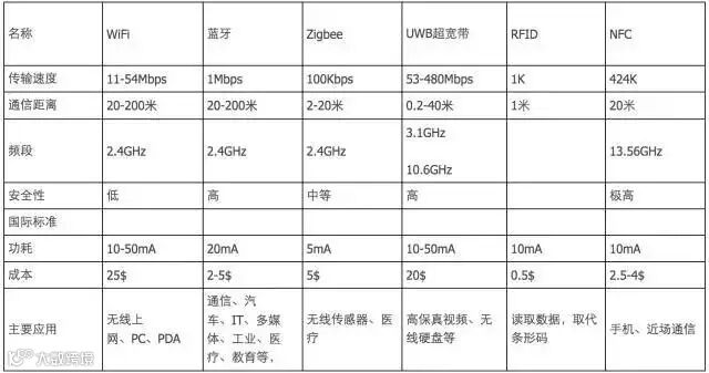 ZigBee、Wi-Fi、蓝牙和几种无线技术的对比如下表所示(点击看大图):