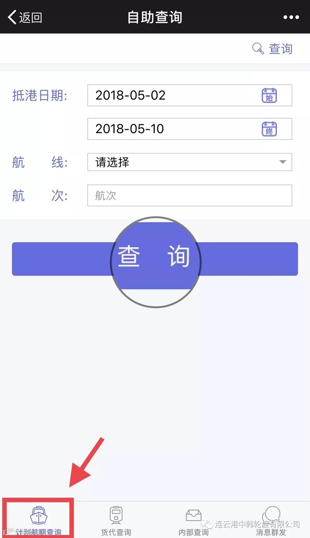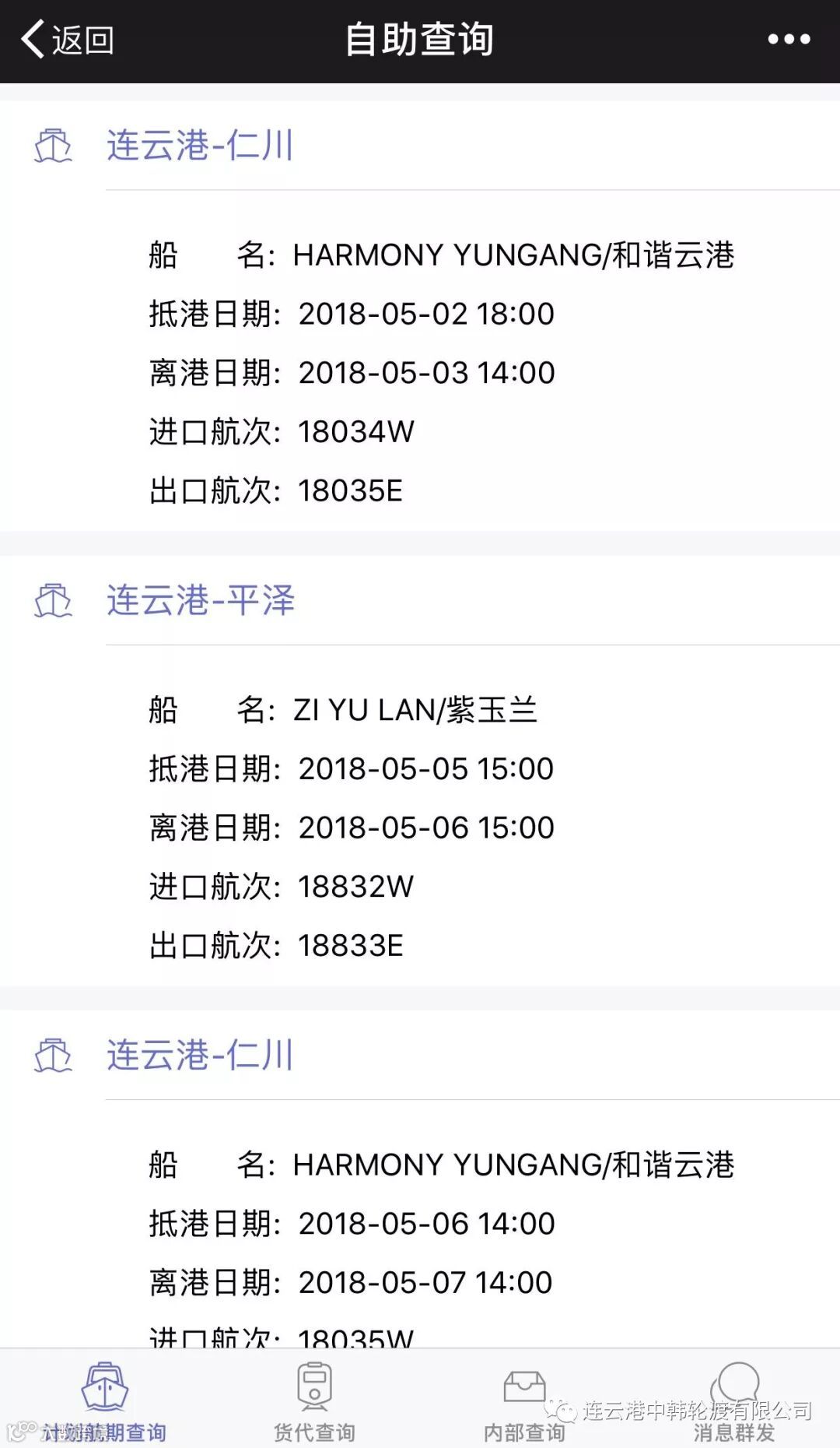 为了更好服务广大客户,连云港中韩轮渡有限公司微信公众号不断增强其功能性,现增加“自助查询”一栏,可用于查询计划航期、接收抵离港信息,也可通过授权自助查询货物信息。