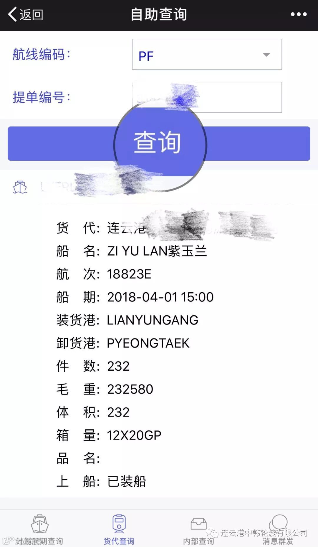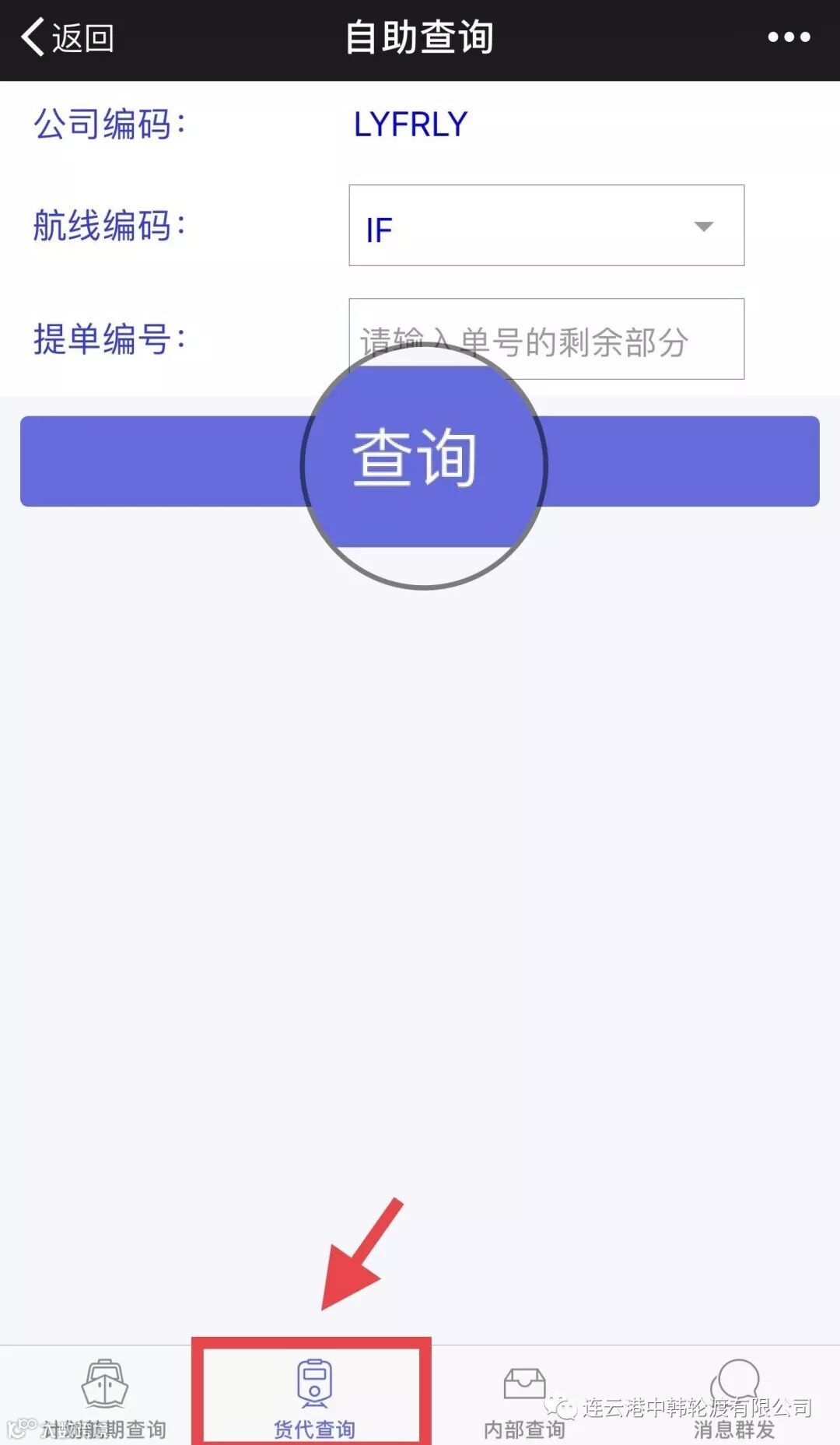第四步:找到【货代查询】这个功能,填写信息,点击查询。 (目前货代查询信息仅面向中韩轮渡公司授权的订舱代理)