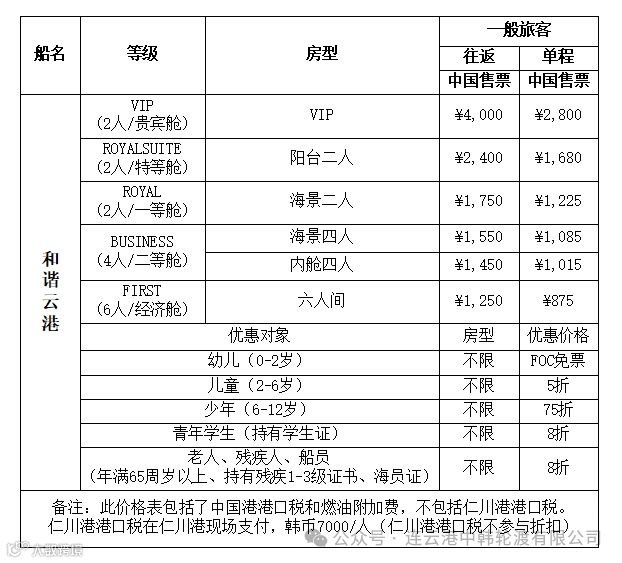 中韩轮渡有限公司客运价格