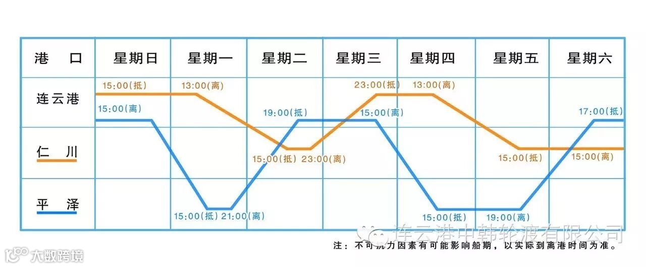 连云港中韩轮渡有限公司主要经营连云港—仁川、连云港—平泽客货班轮航线,是江苏省唯一的国际客货班轮航线。货源地涵盖江苏、浙江、广东、陇海铁路沿线、鲁西南等区域;团体旅客覆盖江苏、安徽、上海、浙江、河南、湖北、陕西、江西等地,运营十余年来与LG、SAMSUNG、东风悦达起亚等韩国知名企业建立了良好的长期合作伙伴关系,与此同时,连云港成为义乌小商品出口韩国最重要的合作口岸。秉承“构建中韩往来桥梁,促进区域经济发展”的企业使命,连云港中韩客货班轮航线已成为中韩经贸往来的桥梁和纽带。
