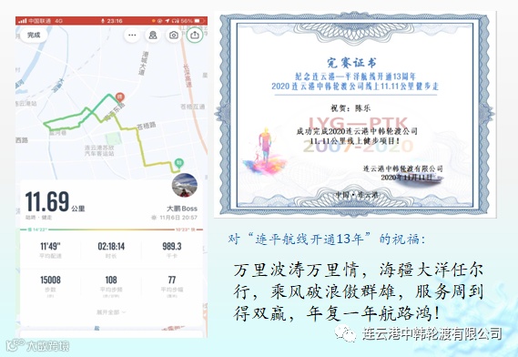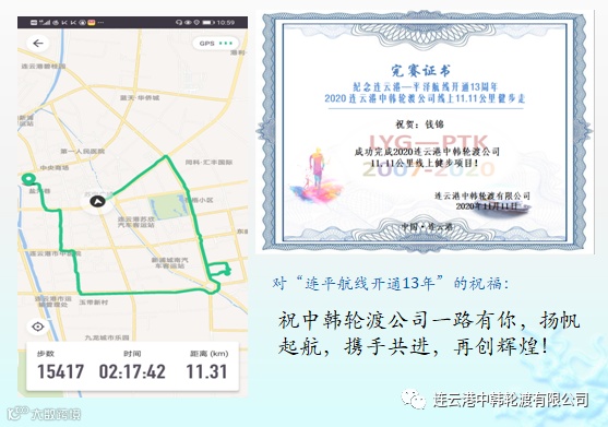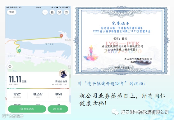值此11月11日连云港至平泽航线开通13周年到来之际,在新冠肺炎疫情防控期间,为丰富职工业余文化生活,创新职工健身活动形式,连云港中韩轮渡公司于11月4日-9日特开展职工业余时间以健步行的方式,共同为“连云港—平泽”航线开通13周年庆祝。