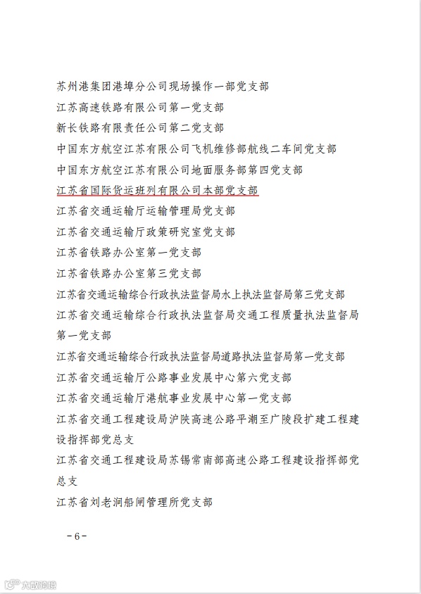 下一步,省班列公司党委将以此次获评荣誉称号为契机,继续发挥基层党组织战斗堡垒和党员先锋模范作用,坚定不移贯彻新发展理念、服务构建新发展格局,深带领广大党员立足职能职责,主动担当作为,以坚如磐石的信心、只争朝夕的劲头、坚韧不拔的毅力,全力开启江苏班列高质量发展新征程,在全省交通运输现代化示范区建设中展现更大作为。