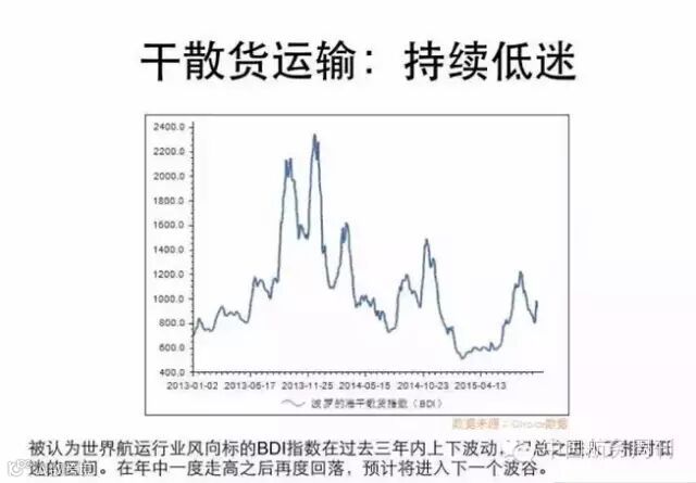 由于铁矿石、煤炭等大宗商品进口乏力,干散货市场预计会持续低迷;集运上运力过剩和需求萎靡的矛盾进一步激化,尽管人民币阶段性贬值能够对冲一部分,但行业仍不乐观;油价大跌刺激全球原油采购需求,但长期与全球经济复苏步伐一致,难以过分乐观。