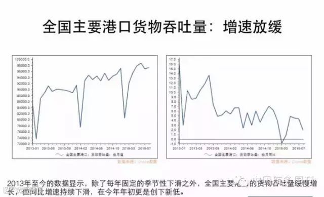 国内外经济低迷,与航运相关的大宗商品价格和进出口价格都大幅回落;2015年 上半年进口累计同比下滑 15.7%,出口也仅增长 0.7%,港口吞吐量同比增长 3.3 个百分点,较去年同期下滑 2.1 个百分点,外贸下滑更甚。