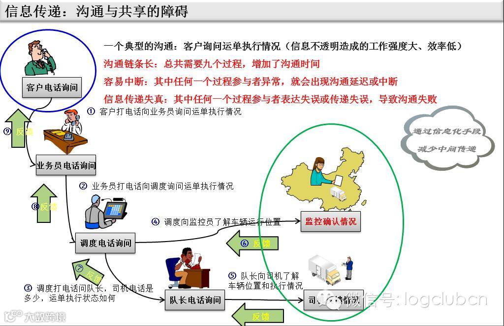 所有的浑水摸鱼,都是因为流程或制度不透明导致投机者有机可乘;而如果能做到信息透明公开,则能实现水至清则无鱼,让投机者无鱼可摸。我们来看以下两个情景。情景一:业务员跑到调度那边说,有个客户的货急着要发,能不能赶紧安排辆车;而调度说因为车辆都发出去了,暂时没法安排车辆,只能等最早发出的车回库再安排。不管业务员或者调度是否有私下原因(可能实际上经常会有),至少业务员和调度都各说各有理,但又互相不信任,然后留下各种矛盾隐患。实际上这是岗位之间职责不透明、信息无法共享造成的。在透明化管理中,不同岗位之间能做到相对透明,岗位之间互相制约,业务员不用去问调度,也能真实查看实际可用车辆资源;调度也不用业务员催促,也能按照订单的紧急程度顺序来指派车辆。我们情景二:客户想问某个订单的执行情况,于是打电话给业务员、业务员问调度、调度问车队长、队长打电话问在途司机,然后司机回复队长、然后到调度、到业务员、最终反馈给客户。从客户询问到获得最终结果,可能要花费几个小时甚至一两天。中间如果有某个岗位的员工暂时不在岗,则整个沟通就中断了。这是整个业务过程不透明、信息不通畅造成的。不同的岗位之间,各自掌握各自的信息,形成信息孤岛,岗位之间没有实现信息共享,相关岗位无法从其他岗位直接获取需要的信息。