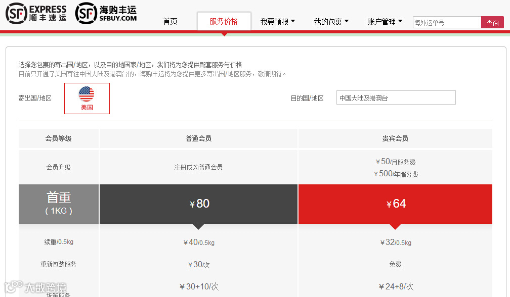 顺丰旗下转运业务海购丰运(SFBuy)迎来上线之后的首次提价。原本一直免费的“拆箱”服务今后将至少加收30元/次的服务费。据了解,SFBuy拆箱服务费于10月27日正式开始收取。收费标准为:普通会员30元/次(一箱拆为2箱),每多拆1个箱另加10元,最多不超过5个。如1箱拆成4个箱子,则收费为30+2*10=50元;贵宾会员24元/次(一箱拆为2箱),每多拆1个箱另加8元,最多不超过5个。