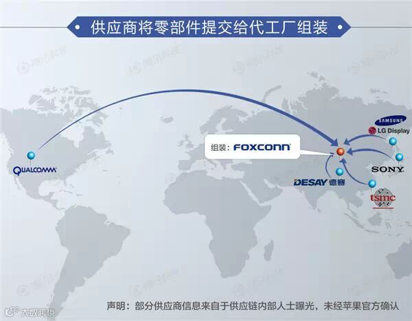 首先,在生产iPhone之前,苹果会将每一个零部件的设计方案交给零部件供应商,而这些供应商负责加工、生产。例如,高通负责生产LTE芯片,三星负责生产内存、液晶面板,索尼负责生产摄像头等等。