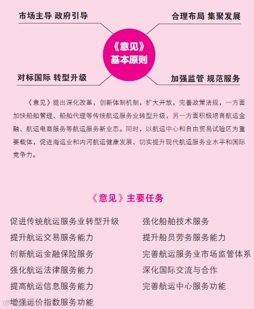 2015年1月5日,《交通运输部关于加快现代航运服务业发展的意见》(简称《意见》)正式发布。《意见》的总体指导思想是,要以航运业发展需求为导向,加快船舶管理、船舶代理、水路客货运代理等传统航运服务业转型升级,积极培育航运金融、航运电商服务等航运服务新业态,以航运中心和自由贸易试验区为重要载体,更好地促进海运业和内河航运健康发展。到2020年,实现基本形成功能齐备、服务优质、高效便捷、竞争有序的现代航运服务业体系的总体目标。《意见》还同时提出了四项基本原则、十一项主要任务和五项保障措施,较为全面地布置了未来一段时间我国航运服务业转型升级的工作。