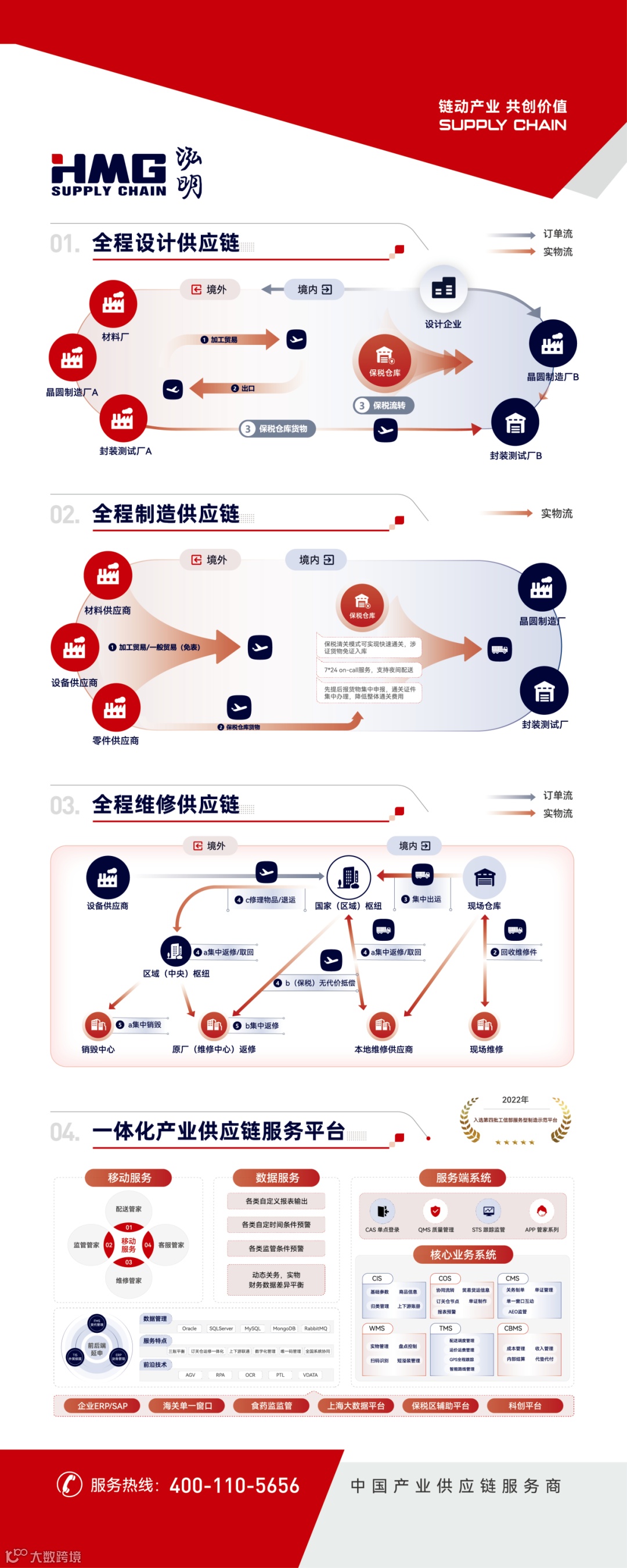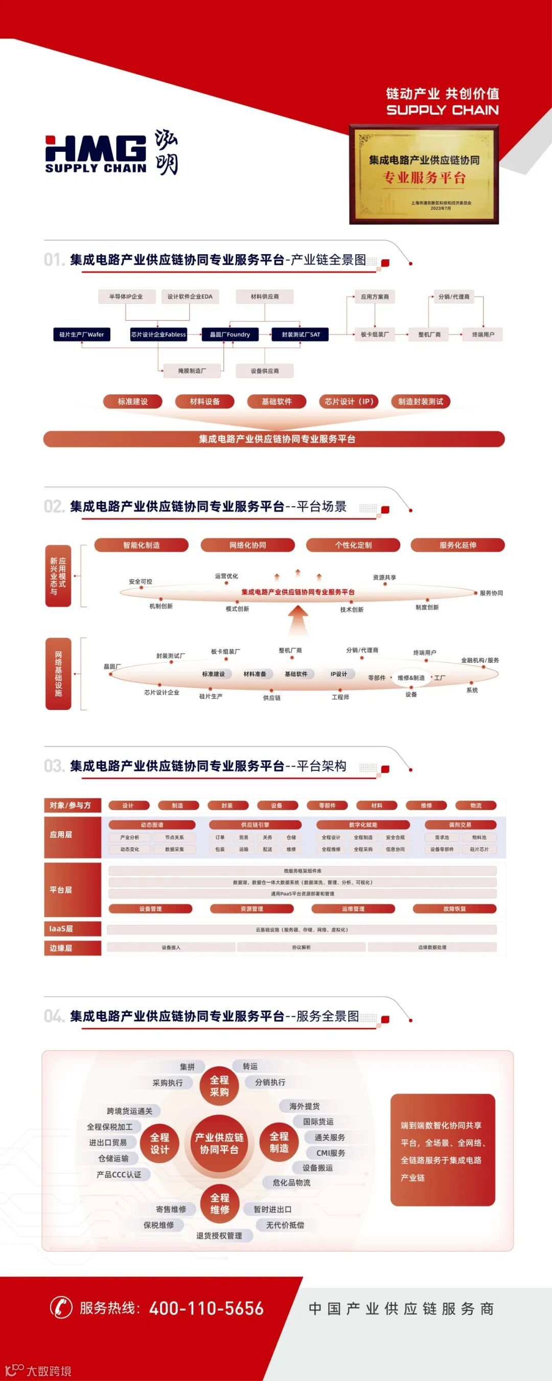 打造多个数字服务平台:集成电路产业供应链协同专业服务平台、一体化产业供应链服务平台、亚太转运中心智慧服务平台、国创集中查检平台 (首家“浦东新区集成电路进出口服务平台”)等,为集成电路产业链客户提供“订贸关仓包运配修”全流程服务,精准高效助力供应链管理。