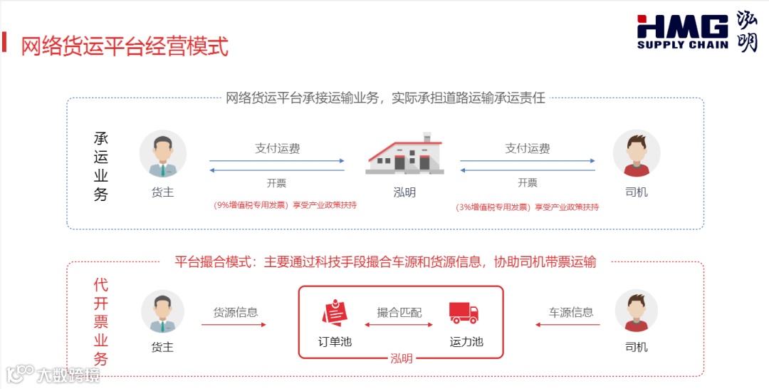 平台撮合模式:主要通过科技手段撮合车源和货源信息,协助司机带票运输;