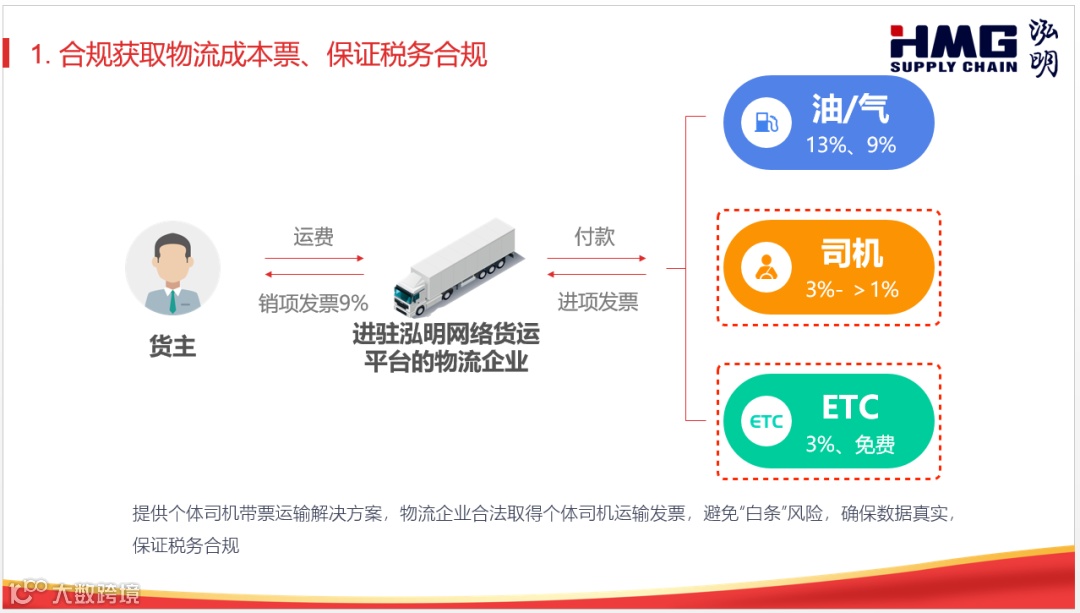 1. 合规获取物流成本票、保证税务合规。提供个体司机带票运输解决方案,物流企业合法取得个体司机运输发票,避免“白条”风险,确保数据真实,保证税务合规。
